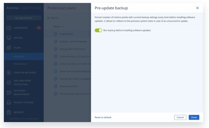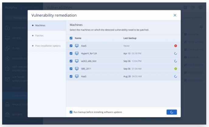 Los parches no son perfectos y, aún habiéndose sometido a las pruebas correspondientes, a veces las actualizaciones provocan problemas en los sistemas. Para ayudarle a mantener continuamente protegidos sus datos, Acronis realiza una copia de seguridad de los sistemas antes de aplicar un parche.